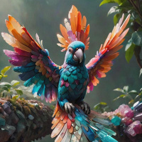 green body with an array of brightly colored feathers on its wings and tail, which include shades of blue, yellow, red, and pink. It appears to have