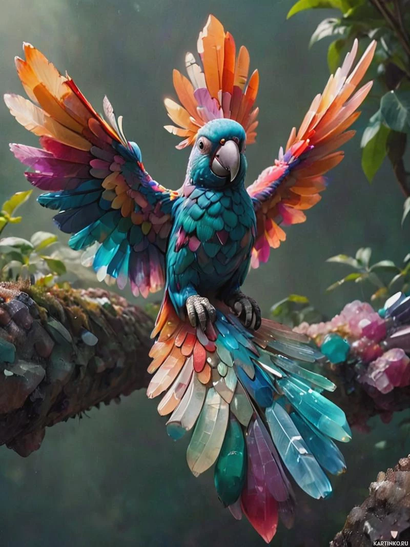 tropical environment with hints of greenery and small rocks or crystals scattered around. The parrot's vivid plumage stands out against the more