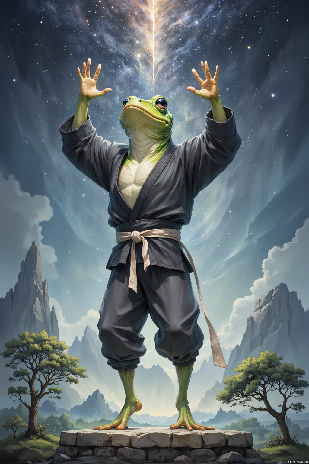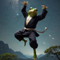 a dynamic pose, as if it is mid-action or casting a spell. The frog has green skin and appears to be wearing