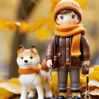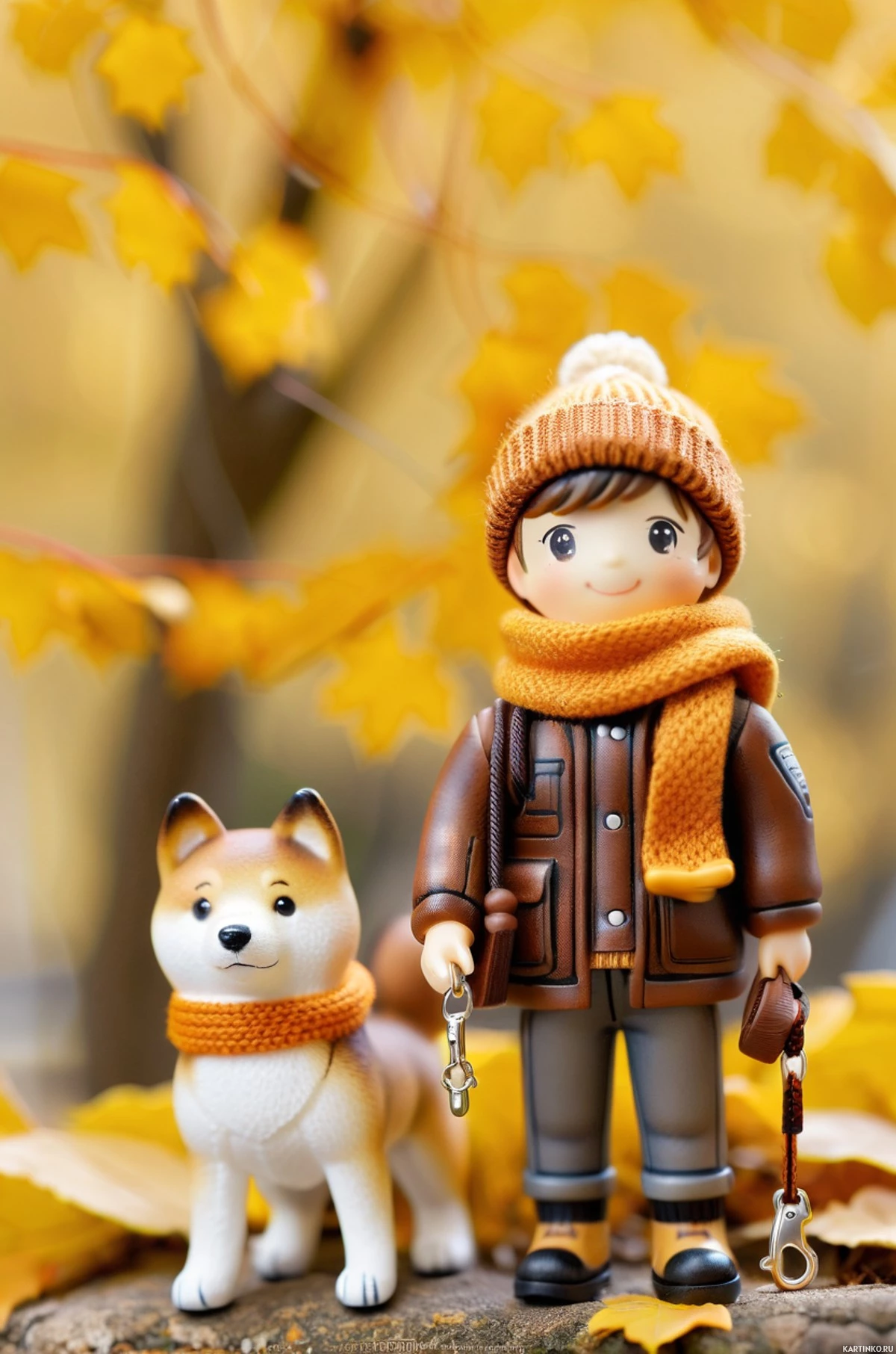 autumn leaves, indicating a seasonal theme. The overall scene conveys a peaceful, seasonal atmosphere, with the two characters interacting as if they were enjoying each other's company amidst