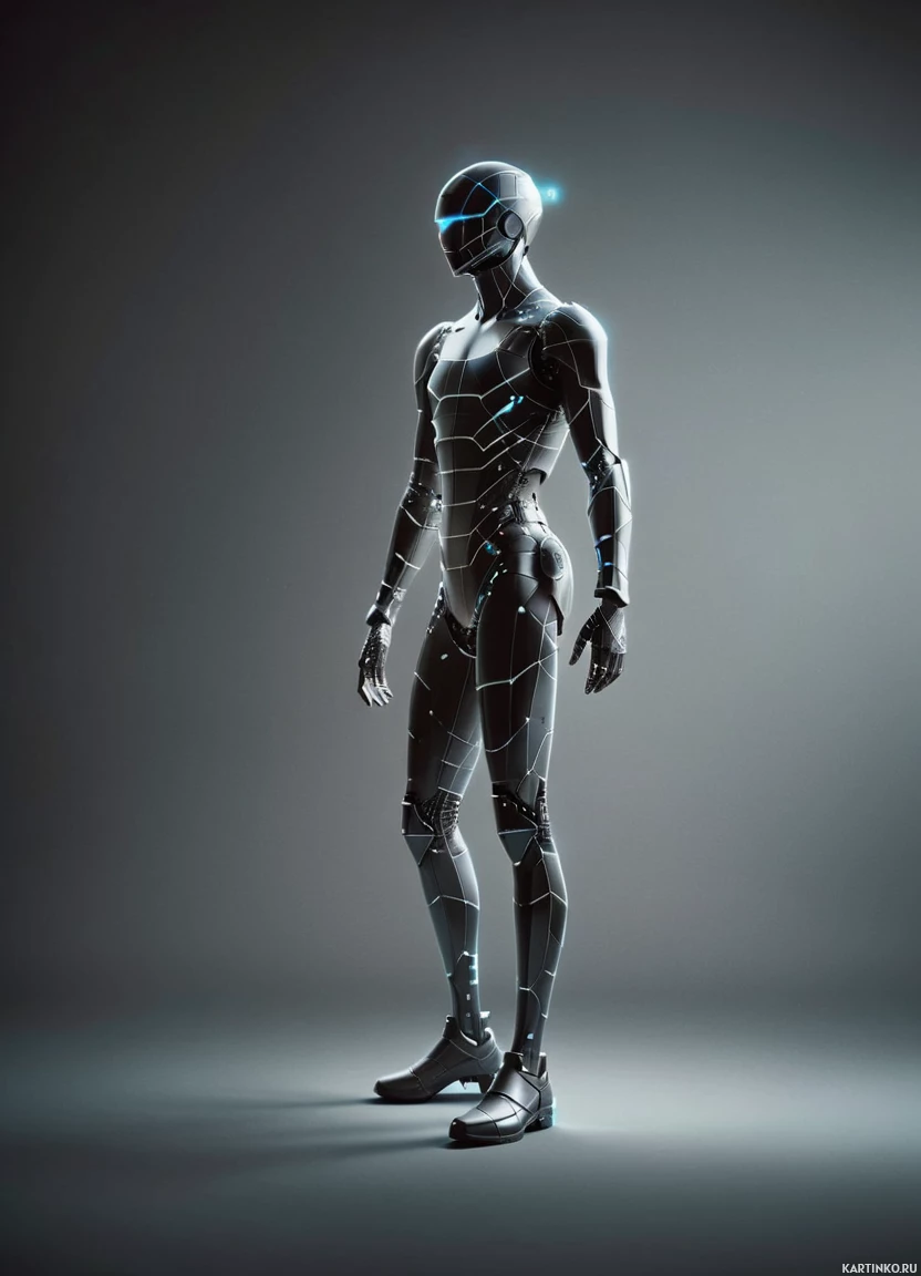 a science fiction-themed robot. The robot is humanoid in shape, standing upright with its hands resting by its sides. It features metallic armor that covers the entire body and includes various components like panels, vents, and lines that suggest