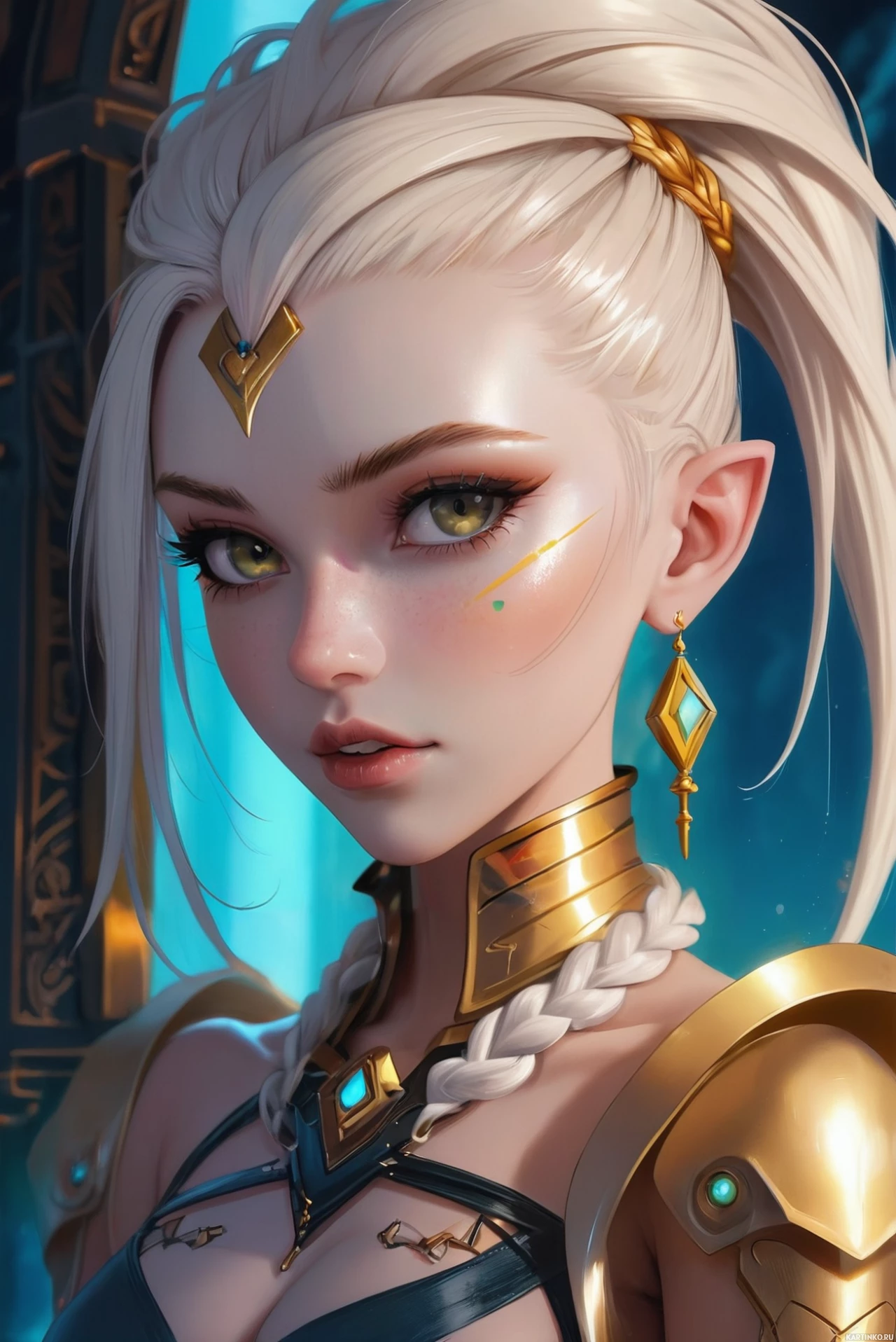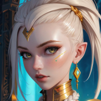 cool tones, with blue and gold accents on her armor and clothing, contributing to a mystical and regal appearance.