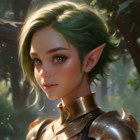 На картинке изображена девушка, похожая на эльфийку, с зелёными волосами. У неё заострённые уши, и она одета в золотые доспехи, украшенные сложными узорами, включая шлем и нагрудник. Выражение лица нейтральное, она смотрит прямо на зрителя.