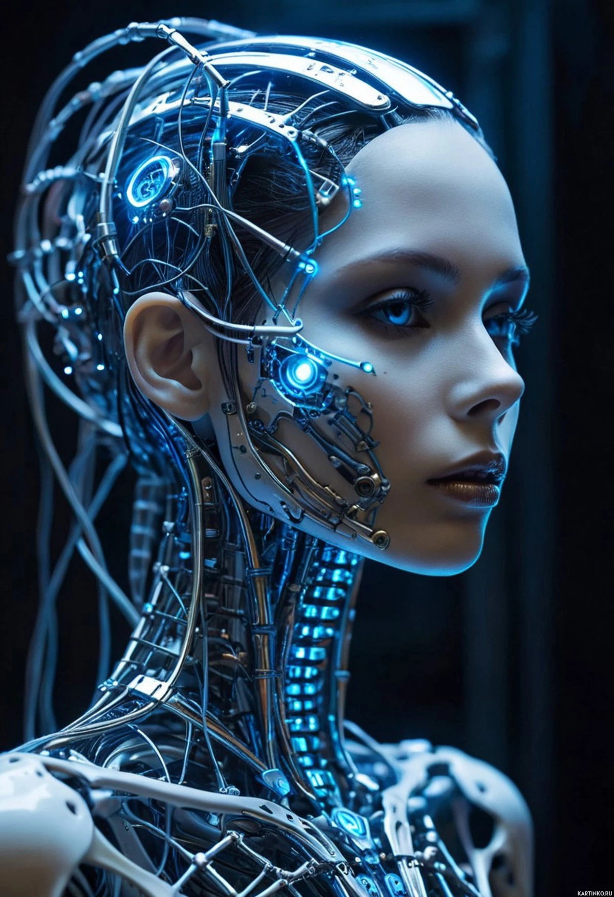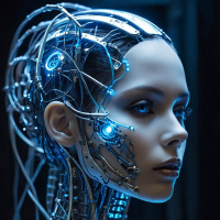 blue accents, which could indicate cooling mechanisms or simply be a design choice to mimic human features. The style of the image is reminiscent of science fiction themes, often associated with robotics and artificial intelligence. It could be from a video game, a graphic novel, or a conceptual artwork inspired by the genre's exploration of advanced technology and the intersection of humanity and machines.