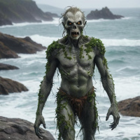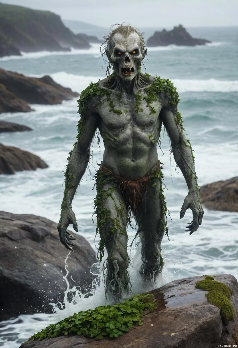 sunken eyes and is wearing what appears to be seaweed or plants as a makeshift garment that drapes over its torso and around its waist, mimicking clothing. Its posture is somewhat hunched over, and the figure's expression seems unnerving, possibly indicative of horror or fear. The surroundings include rugged rocks, a small wave lapping against them, and what could be an island or land mass in the distance under
