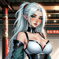 На картинке изображен человек в наряде, напоминающем фэнтезийный или эльфийский стиль. У него белые волосы, заплетенные в два хвостика с красными лентами на голове. Он одет в боди без бретелек с черными кожаными деталями и, похоже, металлическими пряжками на груди. Выражение лица нейтральное.