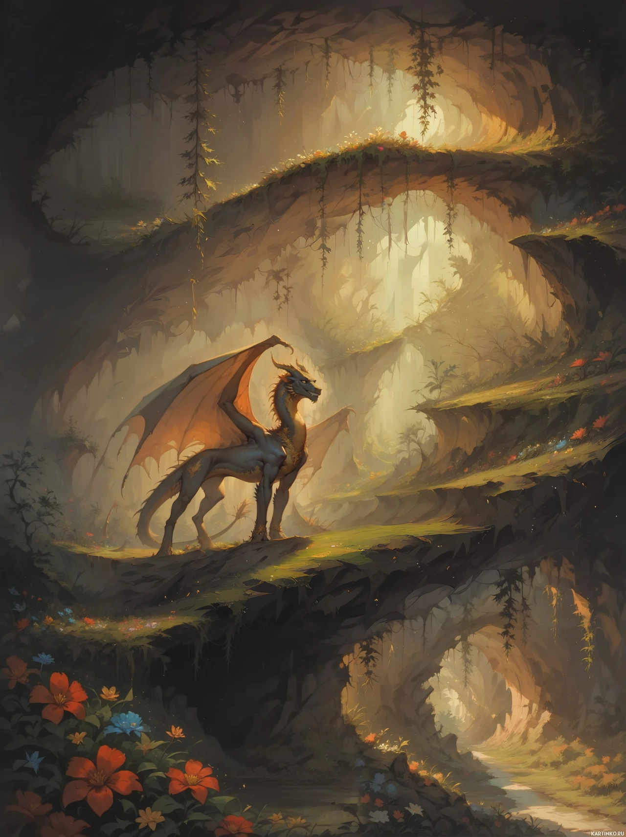 intricate patterns, and it's holding a small, glowing object in one of its claws. The environment around the dragon is lush with greenery and rock formations that resemble natural caverns or tunnels. Some of these caverns have entrances that are lit from within by a soft,