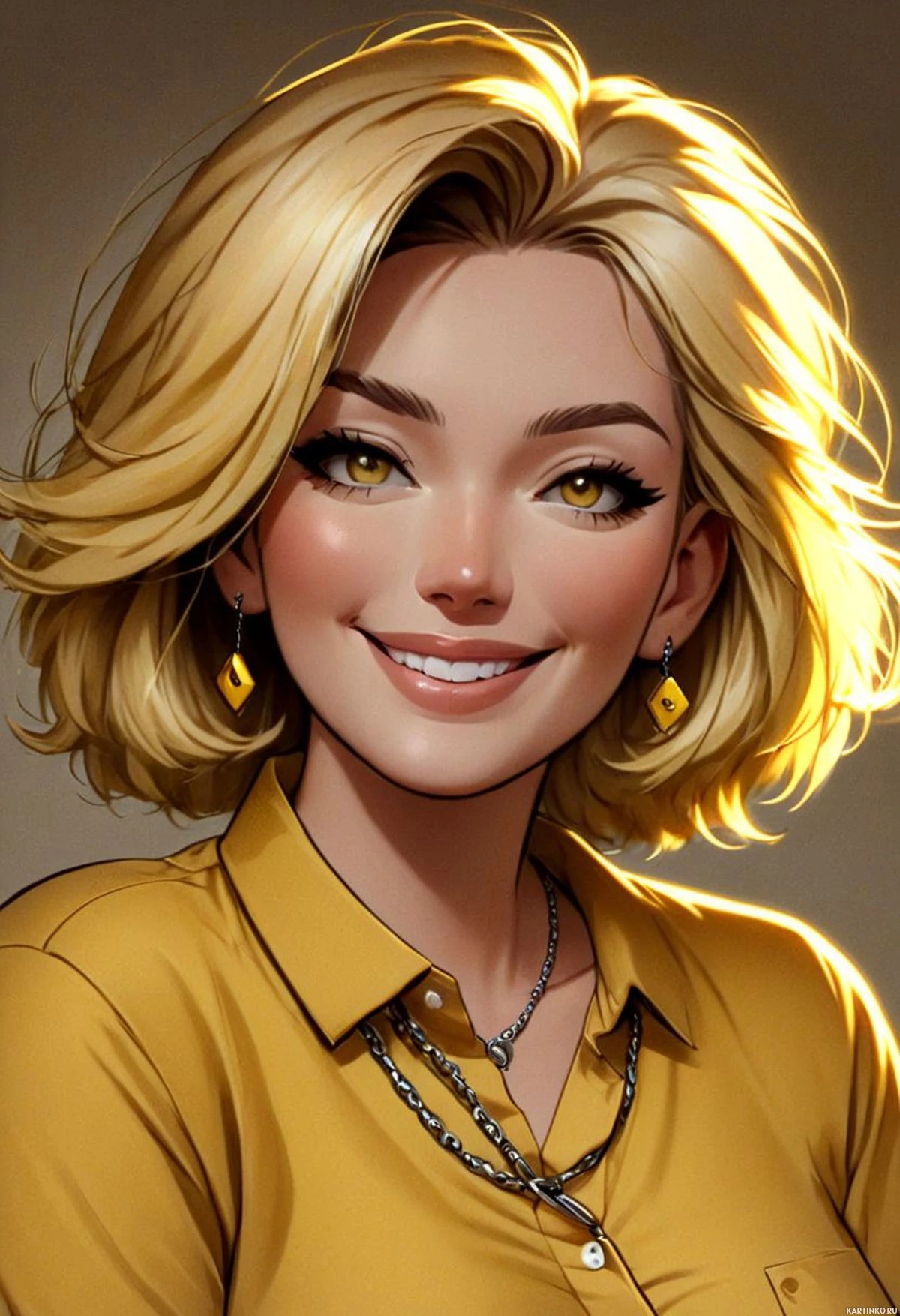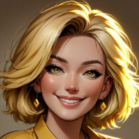 blonde hair and striking blue eyes with a yellowish tint, which could suggest a certain mood or time of day (like morning or sunset) within the context of the image's design. Her facial features are exaggerated in typical stylized fashion for such graphics, emphasizing a youthful appearance with