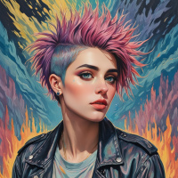 leather jacket over a graphic t-shirt. Behind the person is an artistic backdrop with