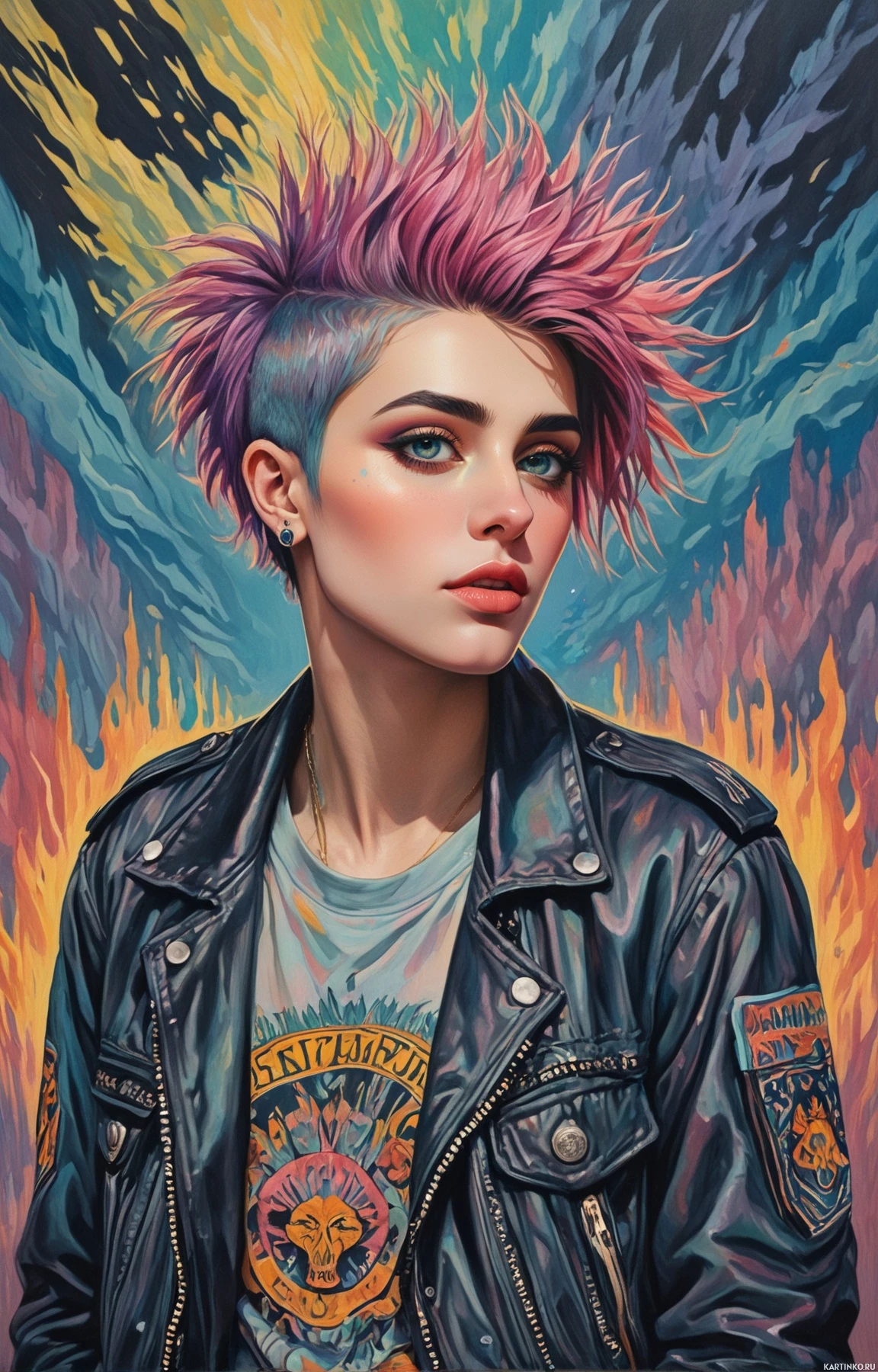 bold colors and expressive brushstrokes that give it an edgy and dynamic appearance.