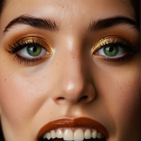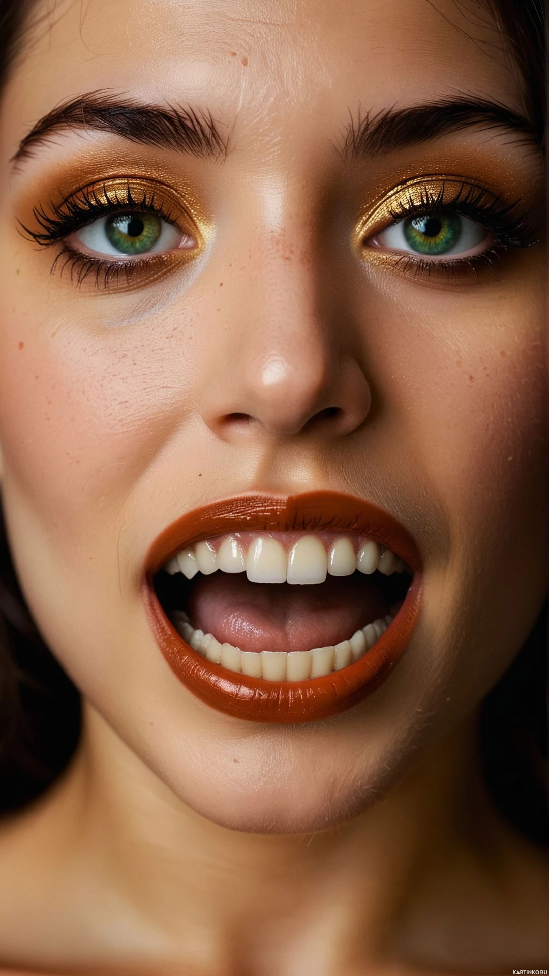 dark lipstick and the other side without any color. Their eye is highlighted with gold eyeshadow, giving it