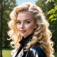 a natural setting, possibly a park or garden, with greenery visible around her.