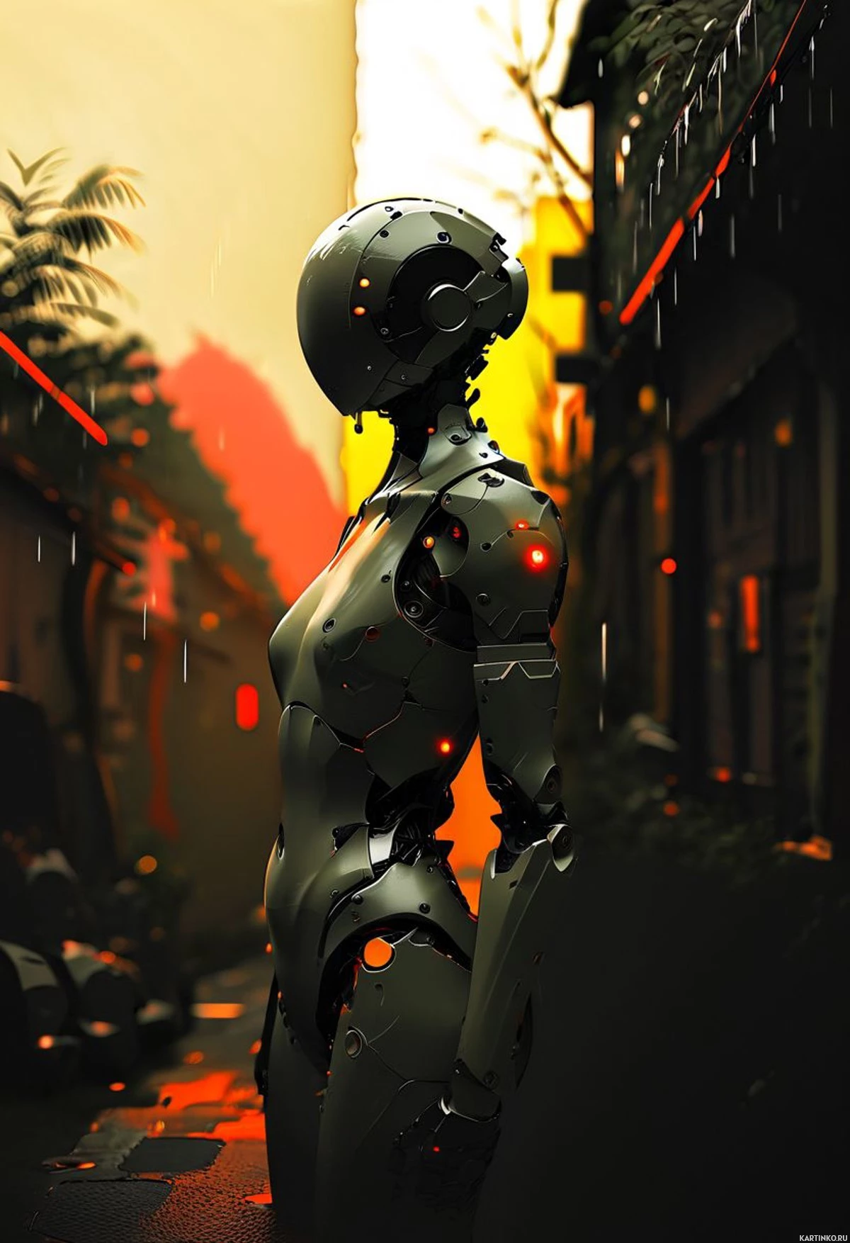 the mechanical components such as bolts and wiring. This android stands against a backdrop of
