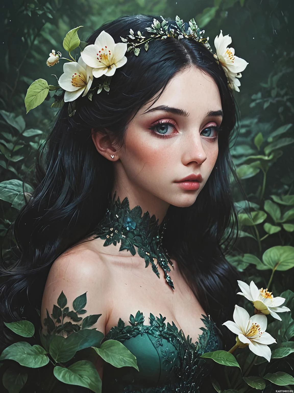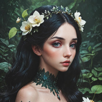 rosy cheeks and detailed eye makeup. She has a small greenery crown resting on her head, adding to the fantastical theme of her appearance. The setting appears to be a forest or garden area, as there are plants with leaves around her, including what looks like a flower at her right shoulder. Her expression is neutral and she seems to be looking directly at the viewer.