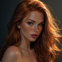 red hair styled in loose waves that fall around her shoulders. Her gaze is directed slightly to the side, and she has