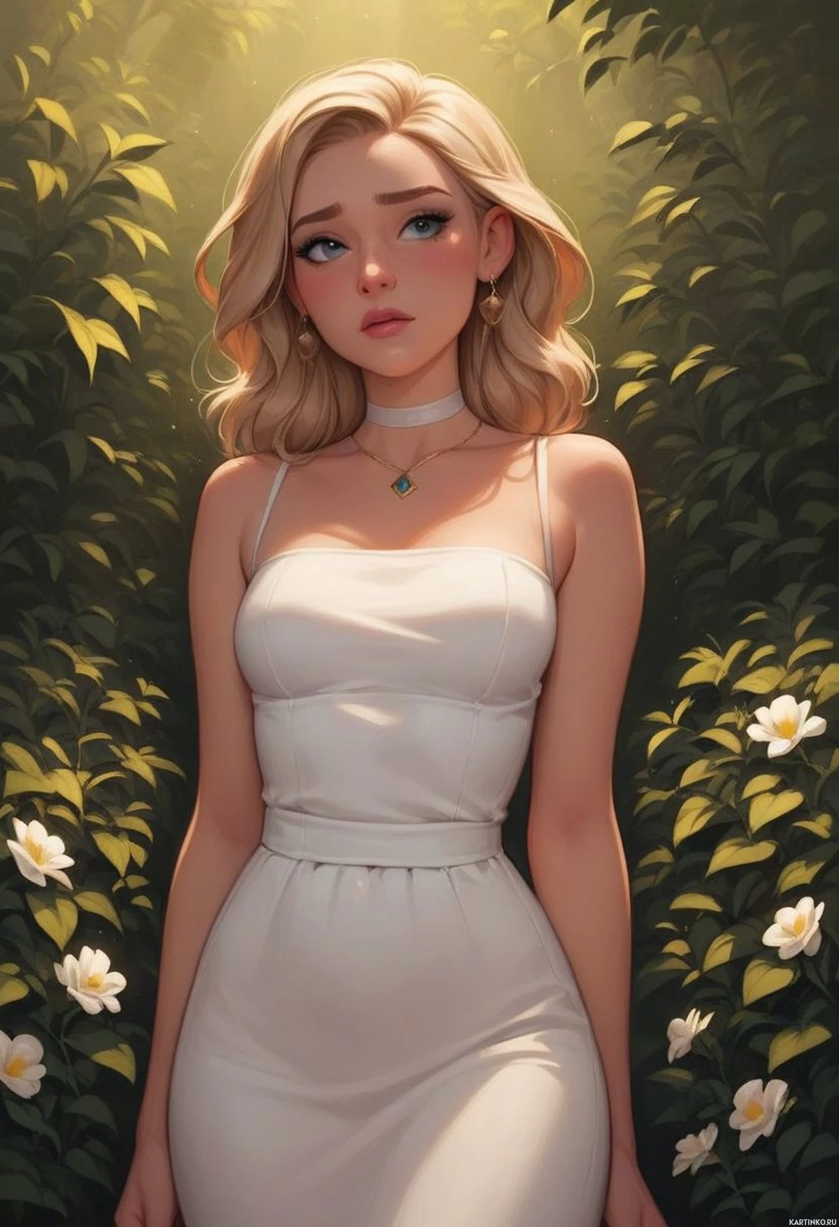 blonde hair and is wearing a strapless white dress that features thin straps across the chest. Her gaze is directed slightly away from the viewer, giving her a contemplative or introspective expression. There are