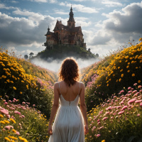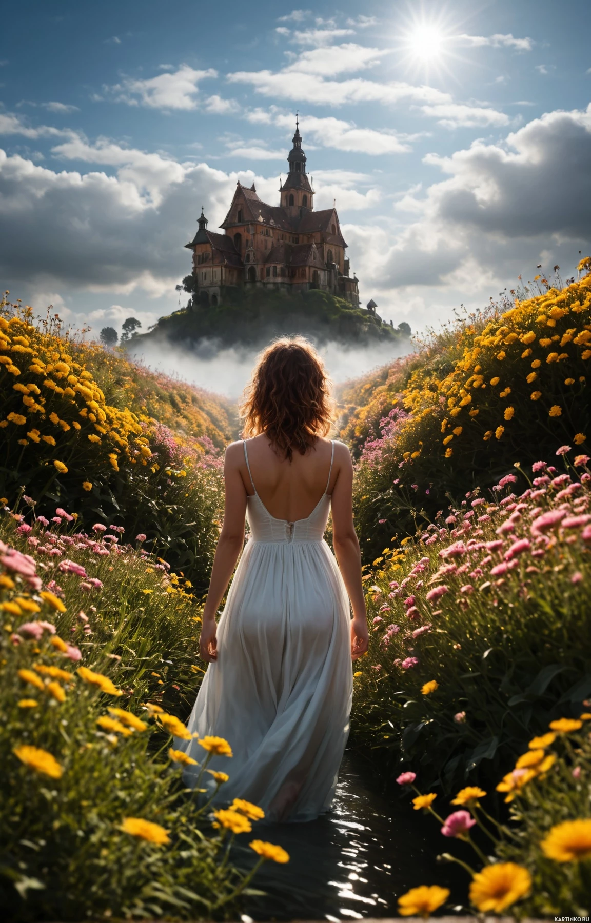 a young woman walking towards a castle on a flower-lined path. She is dressed in a flowing white dress that could be interpreted as classical or mythological attire, and she has