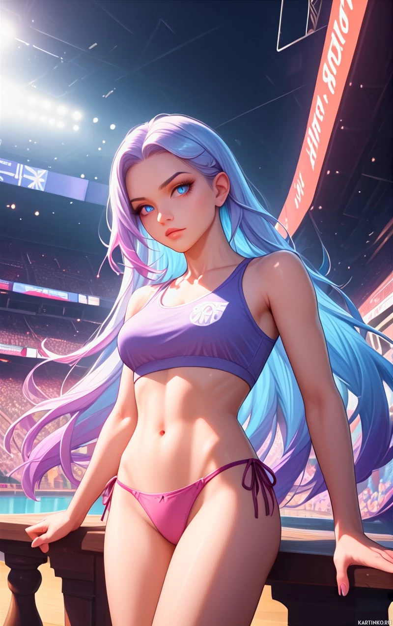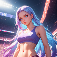 a slender build with visible muscle definition, suggesting athleticism. She wears a purple