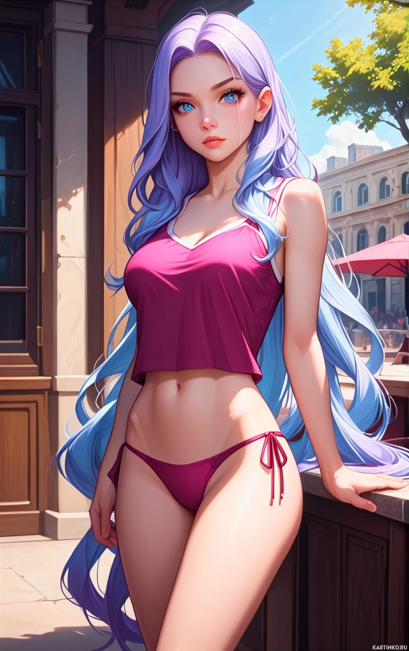 purple hair and is wearing a top with fringe details over her stomach area, paired with a high-waisted bottom that appears to be a bikini. The character is seated and looking directly at the viewer with