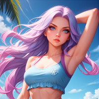 white clouds in the sky, suggesting a serene and picturesque setting. The character is dressed in a bikini that features a tie-dye design, paired with