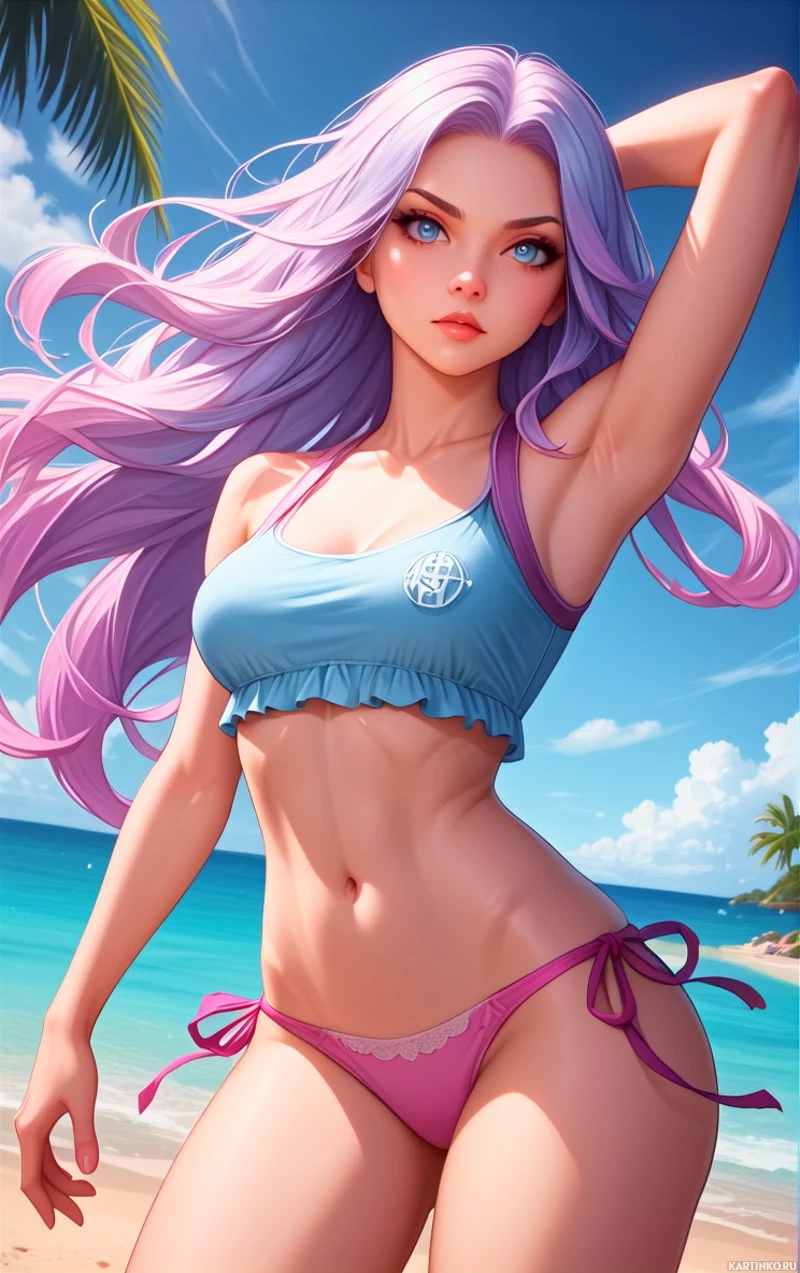 a female character, known for having purple hair. She is standing on a beach with clear blue waters and