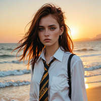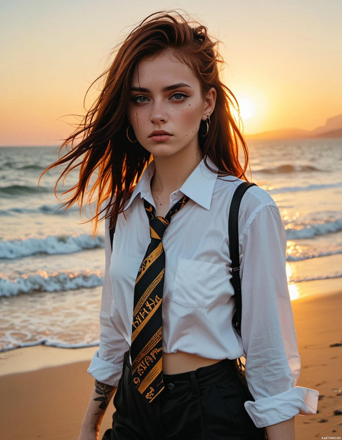 red hair and is looking directly at the camera with a neutral expression. The woman is wearing an outfit that includes a tie, which is not traditionally associated with beachwear but adds a unique stylistic element to her look. Her attire also includes a shirt, trousers, and boots, which suggests she might be dressed for a specific theme or event. The background features the sky transitioning from daylight to evening hues, with