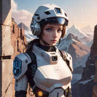 futuristic armor. She appears to be wearing a helmet with a visor, which suggests she might be engaged in some form of action or exploration that requires
