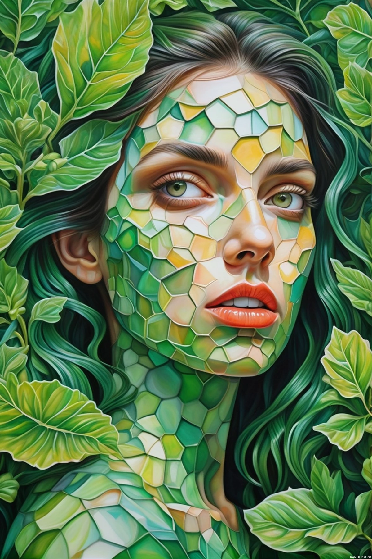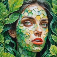a young woman with long, flowing green hair that is adorned with small green leaves. Her makeup is intricate and artistic, incorporating what appears to be moss-like patterns on her face, enhancing the natural theme of the artwork. She has striking