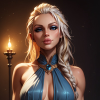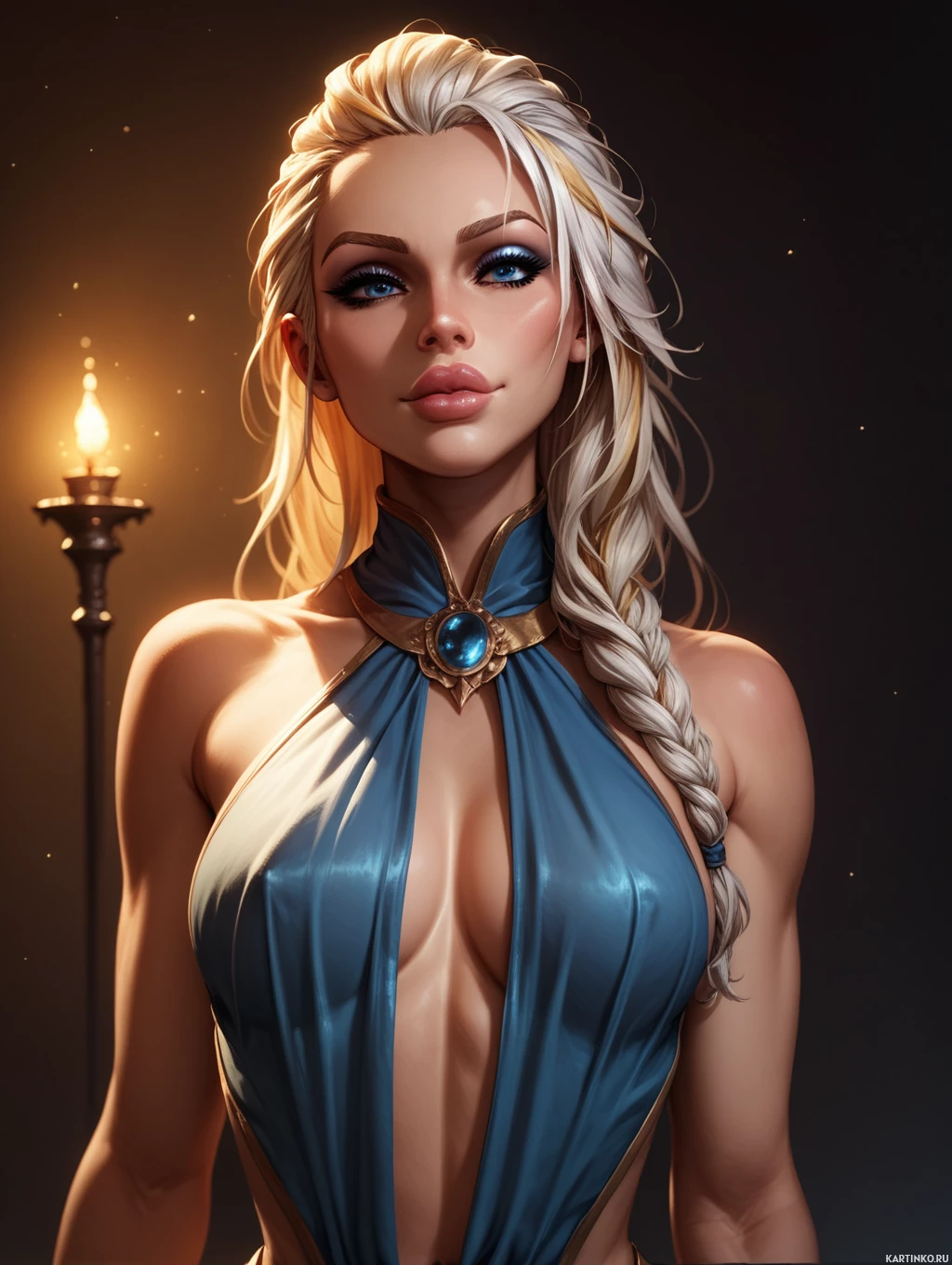 blue eyes and is wearing an armor that appears to be inspired by Norse or Celtic design, featuring what looks like gold embellishments and a large brooch on her left shoulder. The character is holding a torch in her right hand. There are no candles visible in the image, but she does have an amulet around her neck that resembles a rune or similar symbolic element. The character exudes