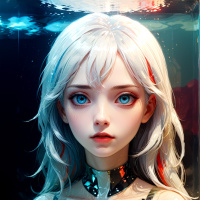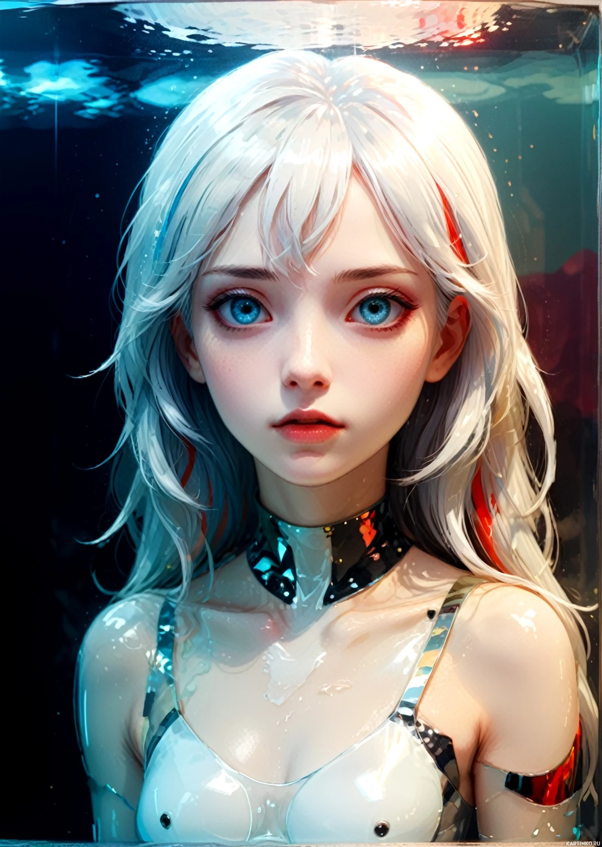 a body of water or liquid around her, suggesting an aquatic theme. Her expression is neutral with