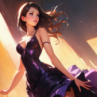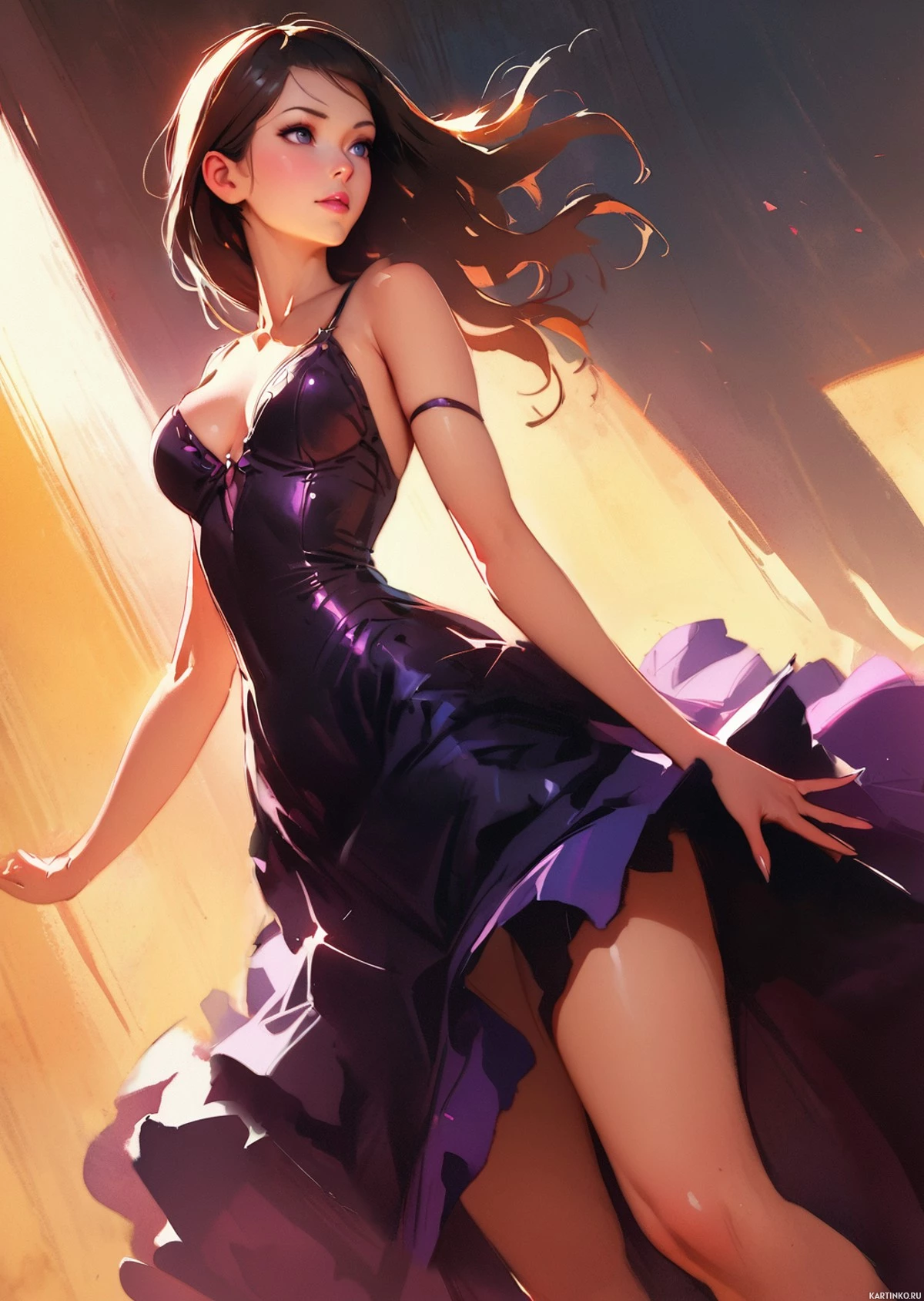 purple dress that appears to be tightly fitted, with lace or sheer panels, suggesting a costume or special attire for the character. Her pose exudes confidence, with her left hand on her hip and her right arm gracefully stretched out towards the viewer. The setting conveys