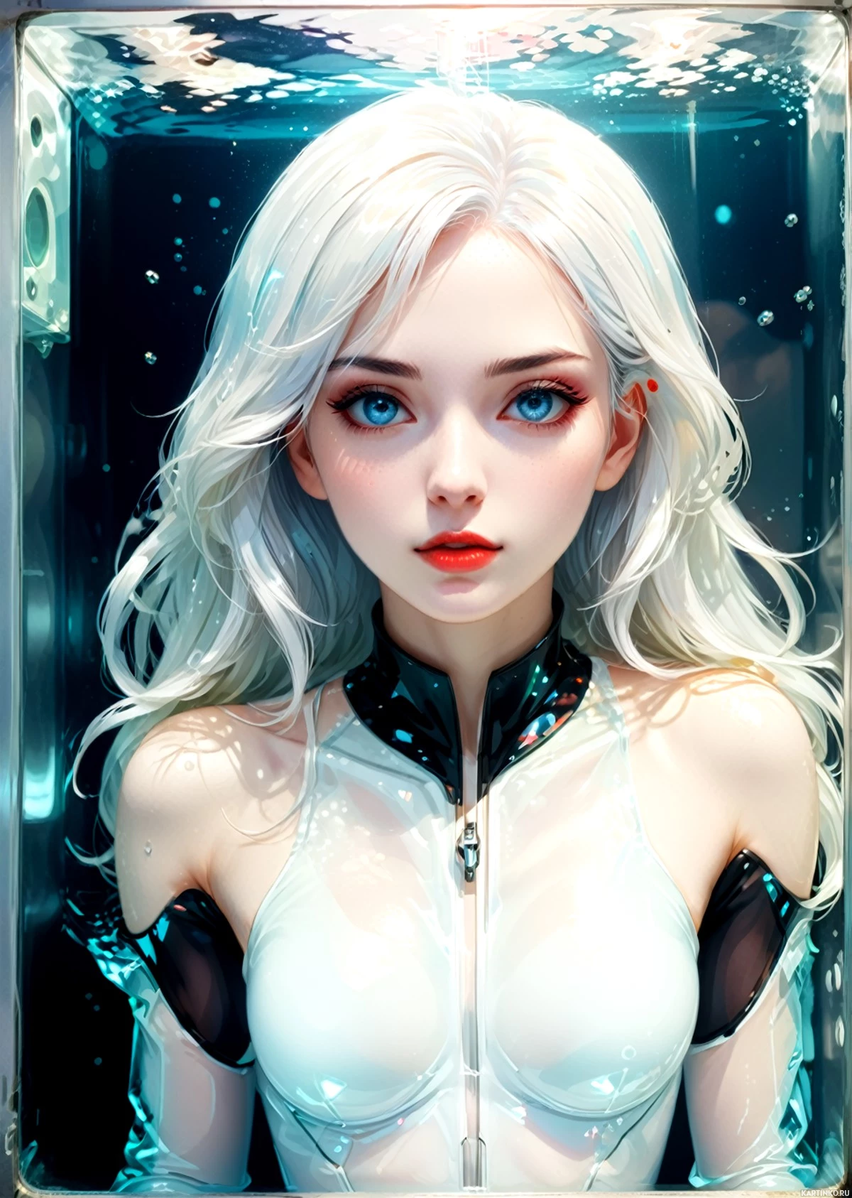 blue eyes and is wearing what appears to be futuristic or cyberpunk-inspired clothing that includes elements such as metallic detailing and a suit-like structure. The style suggests she might be depicted as an android or a character from