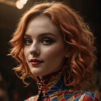a young woman with shoulder-length red hair. She is wearing a vibrant, colorful jacket that appears to have elements of
