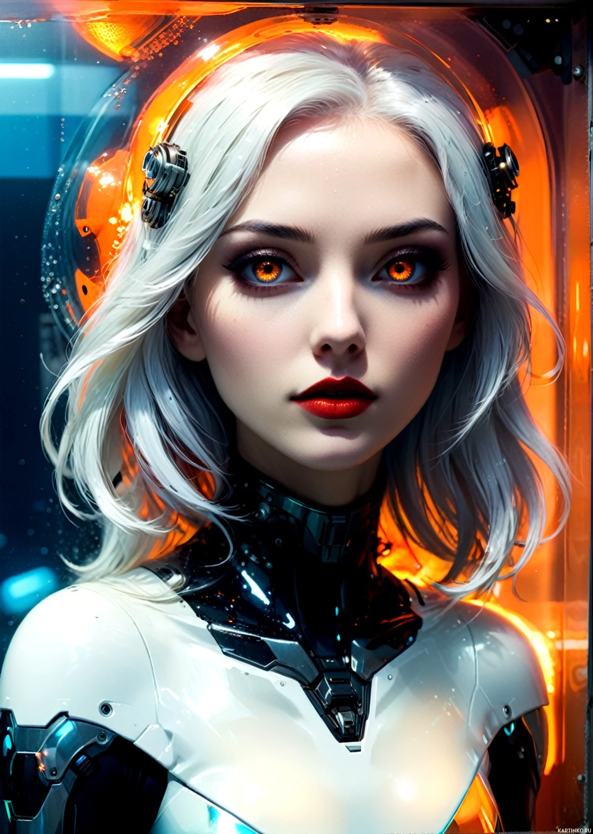 a science fiction context. The girl has a robotic or cybernetic appearance, with visible circuit-like patterns on her skin and mechanical details suggesting she is part of a larger