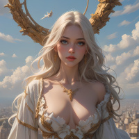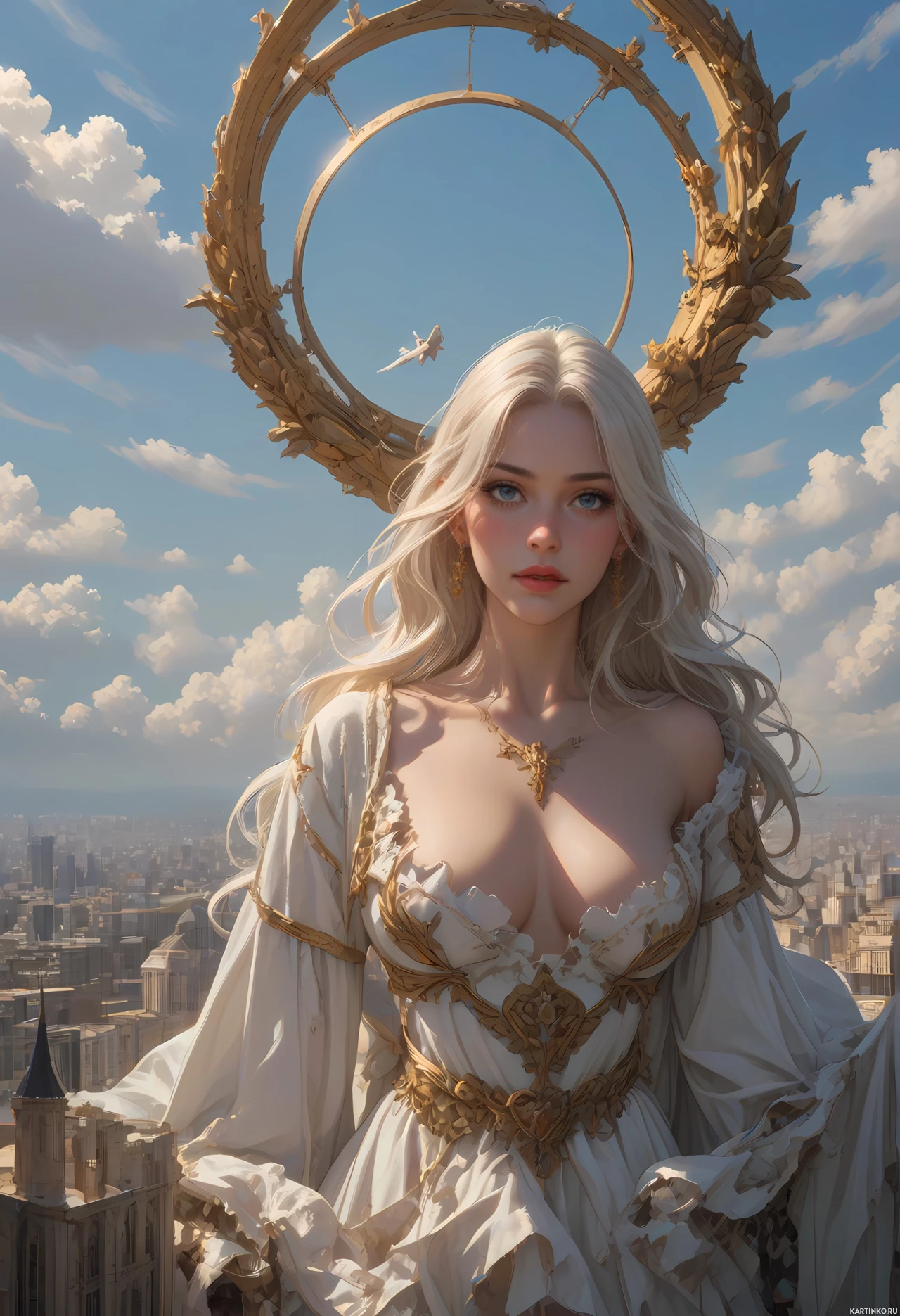 gold accents, a high collar, and what appears to be armor with decorative elements such as feathers or wings. Her right hand is raised slightly towards her chest, while her left hand is open and facing upwards. The background shows a city skyline under a clear blue sky, suggesting