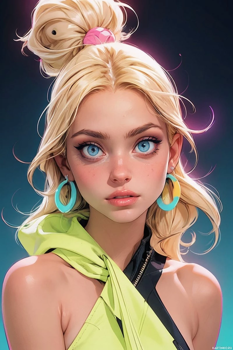 На картинке запечатлён человек с светлыми волосами, уложенными вверх, и крупными круглыми серьгами. На лице – макияж с чёткими бровями, пушистыми ресницами и помадой натурального оттенка. Выражение лица нейтральное. На нём яркий жёлтый худи с чёрной молнией, а на талии, хоть и не полностью видно, присутствует тёмный элемент одежды или аксессуар.