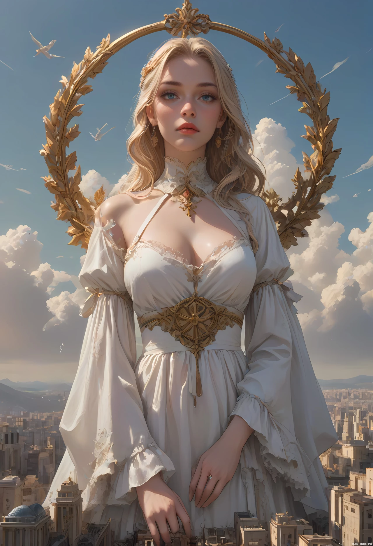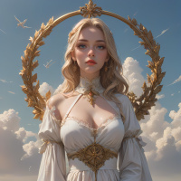 golden dress and has wings attached to her back, suggesting she may be portrayed as an angel or divine entity. Her expression is serious, and she is looking off to the side rather than directly at the viewer. The background of the image shows a cityscape that includes a skyline with recognizable buildings such as skyscrapers, indicating that this could be a depiction of New