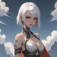the dark color of the material. The character's pose suggests confidence or readiness for action. The background features a mountainous landscape under