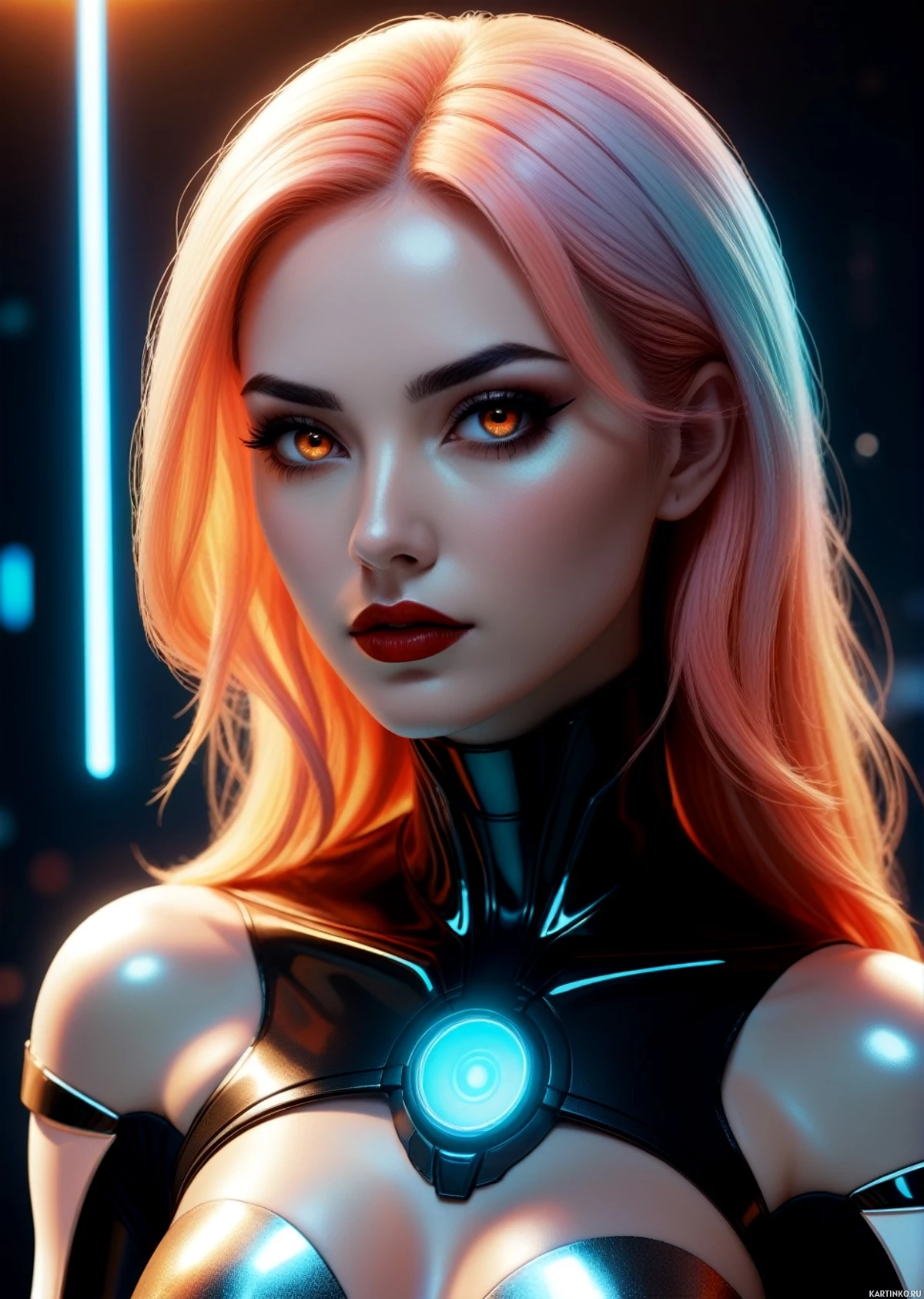 power source within the context of this character's universe. The background is blurred with hues of blue and pink, giving it a somewhat ethereal or otherworldly ambiance, and there are small glittering particles that add to the magical or science fiction atmosphere. The overall impression is that of a female warrior or heroine, possibly from a video game, comic book, or animated series.