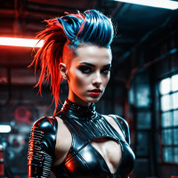 blue hair and is wearing a black bodysuit with leather-like accents, including straps around her arms and shoulders. Her pose is confident and assertive, with one hand on her hip and the other slightly extended as if she's about to make a gesture or move. The environment suggests a futuristic or science fiction theme due to
