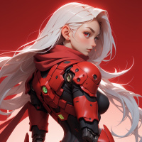white hair and is wearing a red armored outfit, which includes a chest piece with intricate designs and high-tech components that suggest advanced technology or robotic elements. From this viewpoint, she appears from behind, giving a back perspective of her figure. The overall composition suggests she may be part of a futuristic scenario, possibly as a warrior, soldier, or heroine in