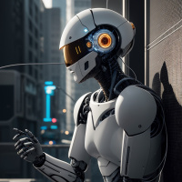 an urban setting given the backdrop of buildings. The robot has a realistic human-like head with