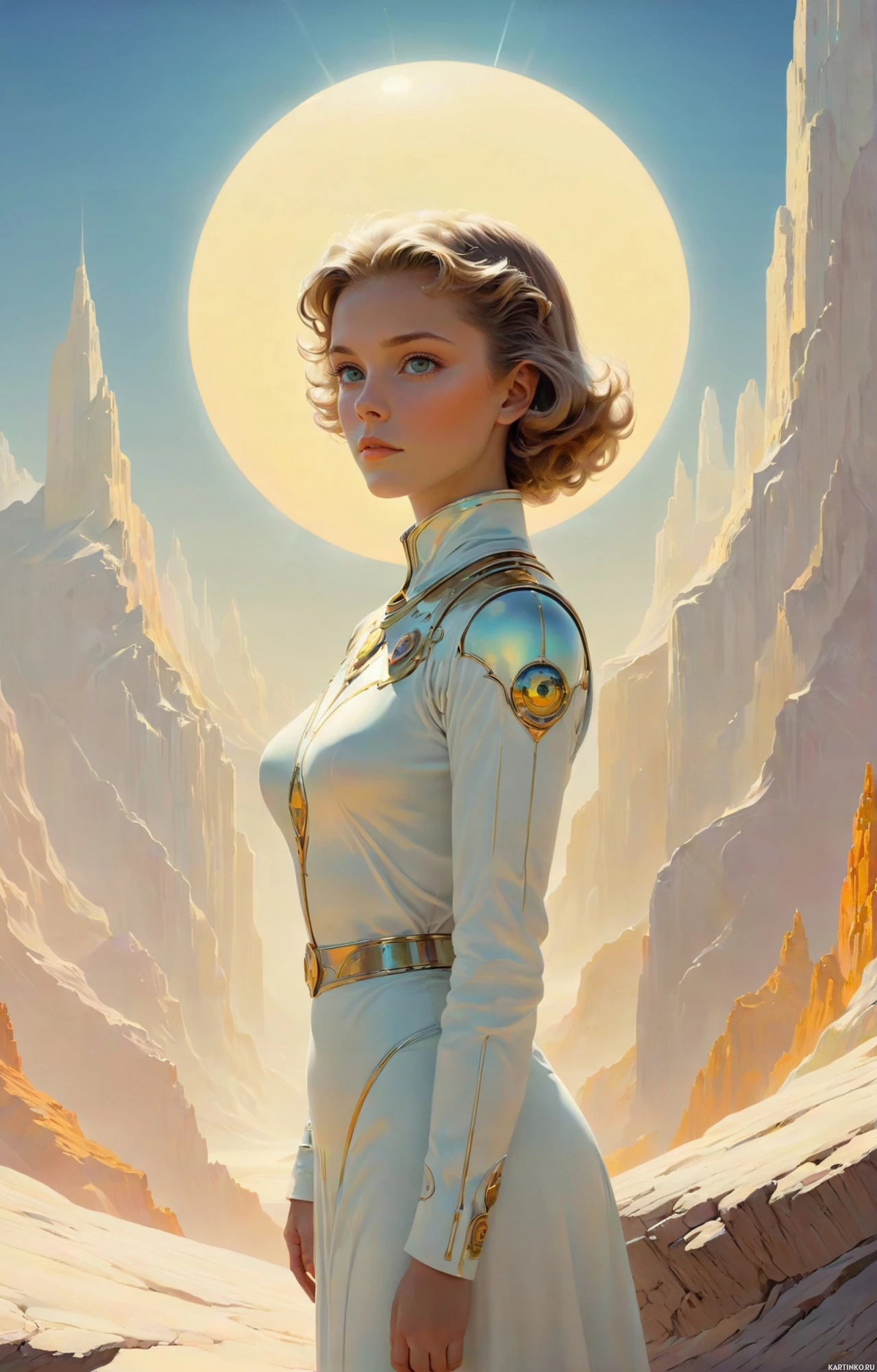 a barren landscape with rocky outcrops and what might be a castle or fortress in the distance, under a brightly lit sky that could indicate either sunrise or sunset due to the lighting conditions. The woman's attire and the setting give an impression of a scene from