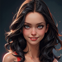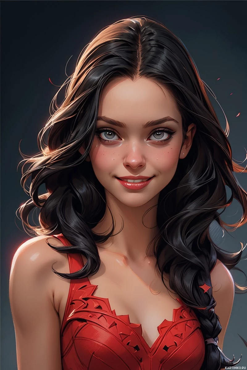 natural beauty without appearing overly dramatic or heavy-handed. She is wearing a dress that appears to be a red, strapless number adorned with a pattern that could suggest