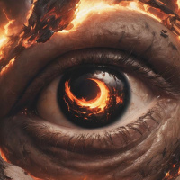 molten lava or flames. Surrounding the eye is a grayish texture that could be interpreted as a face or mask in shadow. The image has a surreal and intense quality, with the contrast between the cool blue of the iris and the fiery intensity behind it creating a striking