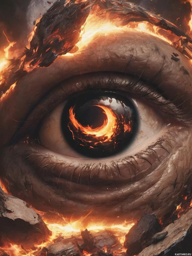 The image depicts a close-up of an eye with a fiery,