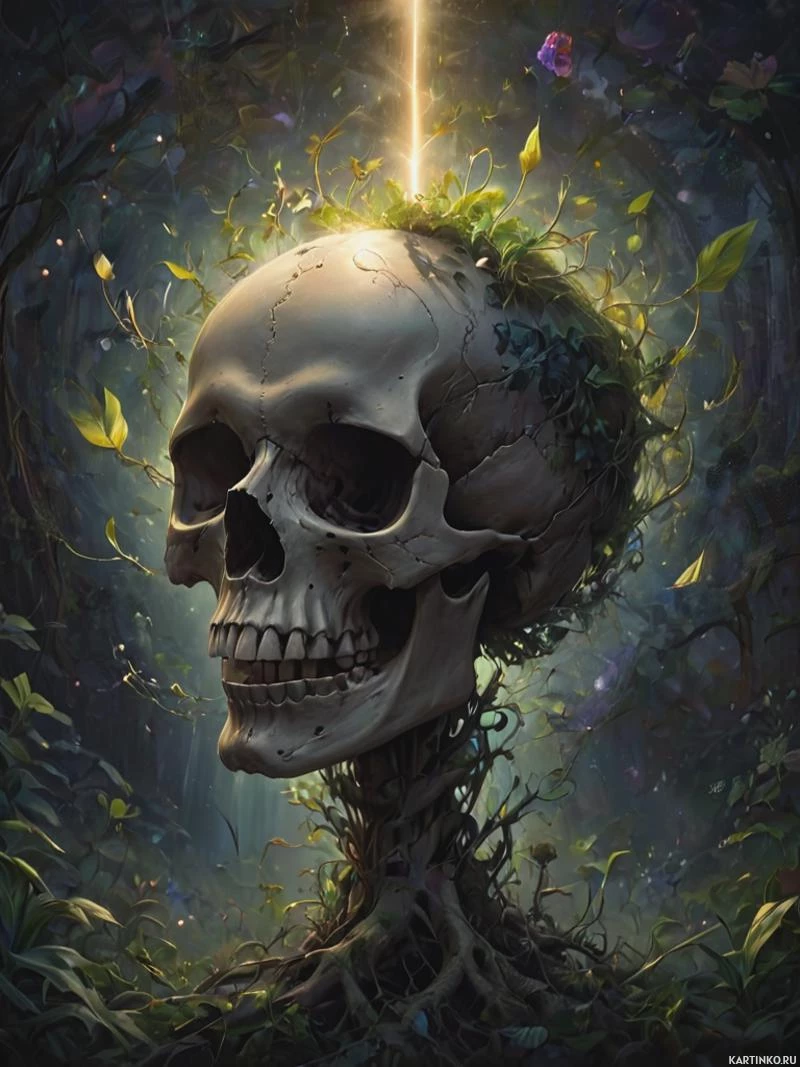 The image features a skull with a tree growing out of it, set against a backdrop that appears to be a forest. The skull is surrounded by natural elements such as moss and roots that weave around it. Above the skull, there's a sunbeam streaming down, illuminating the scene. The colors in the image are vibrant with