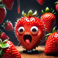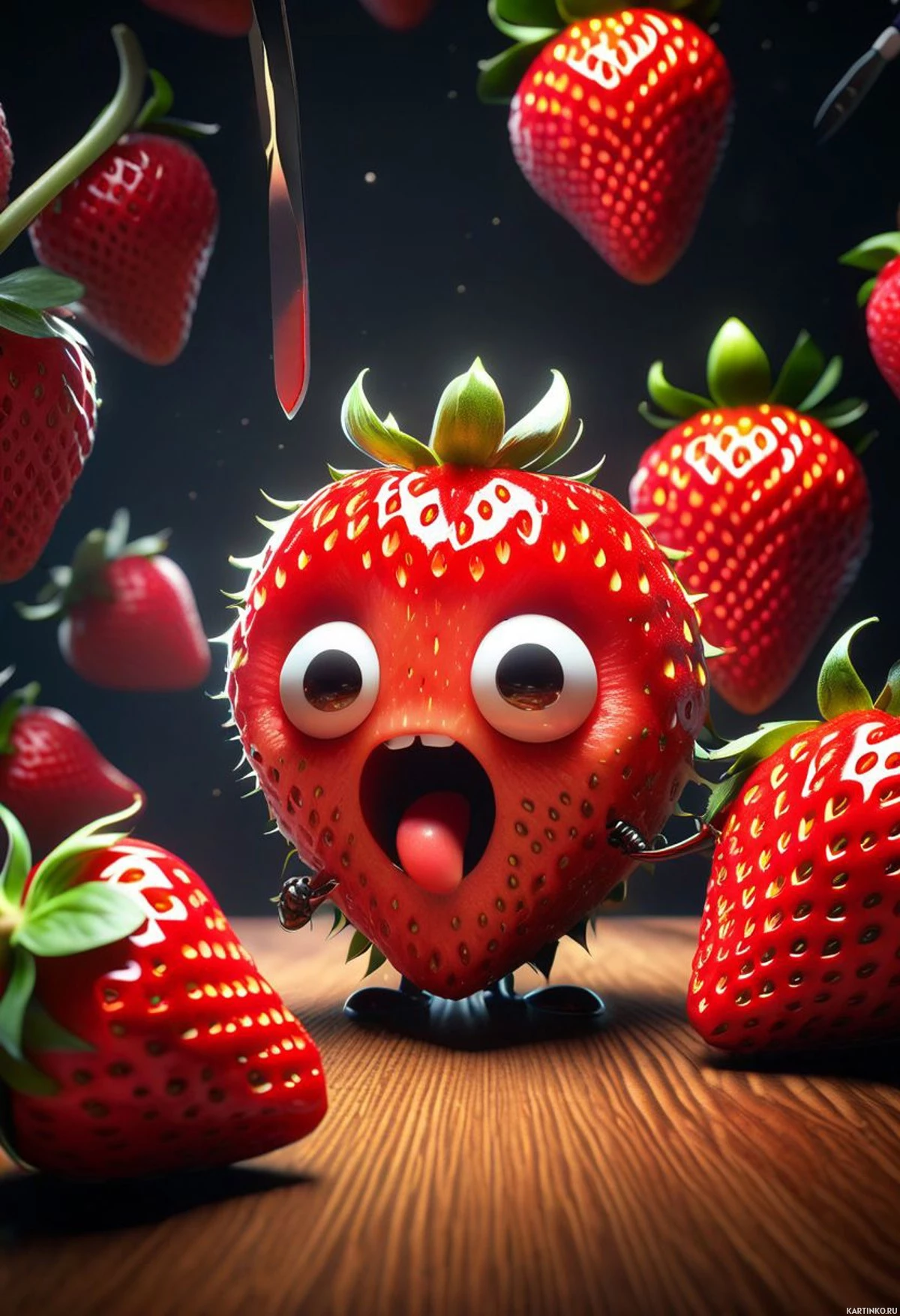 open mouth and wide eyes. Surrounding this central figure are multiple red strawberries, each with