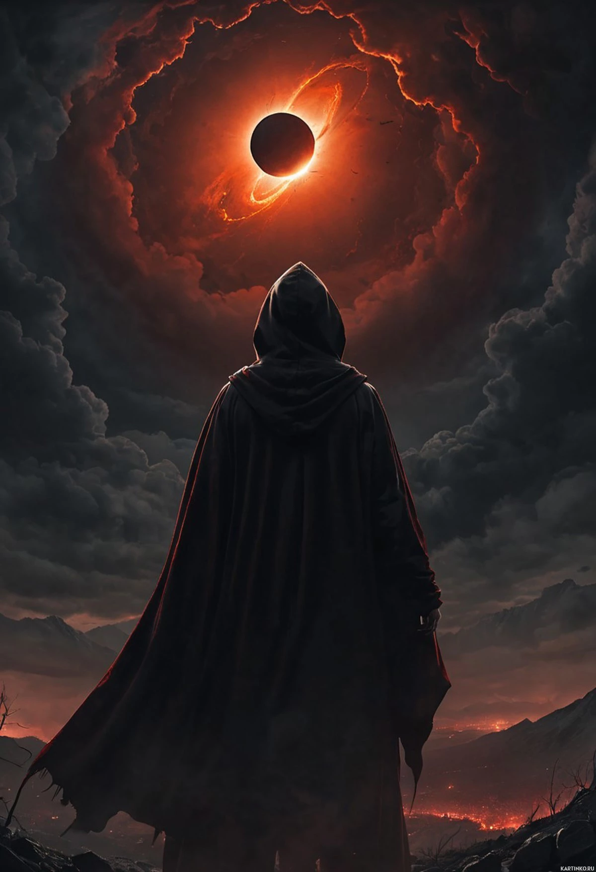 a hooded figure standing in front of an ominous, fiery landscape. The figure is depicted from behind and is facing away from the viewer, giving