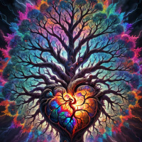 The image features a fantastical tree with three large hearts integrated into its trunk. Each heart is filled with a different colored fluid, representing emotions such as love, anger, and sadness or joy. Surrounding the tree is an ethereal landscape with rocks and a faint light in the background. The scene has a dreamlike quality to it.